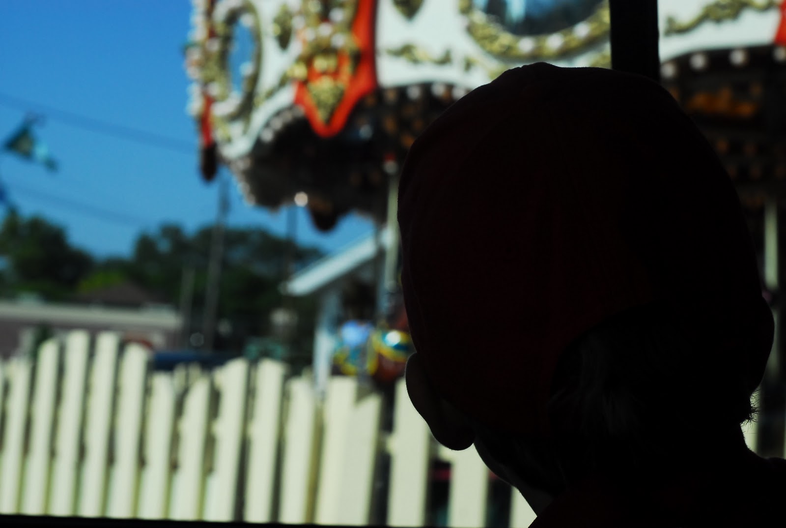T-man (Tristan) looking at the merry go round after we had finished eating at Elles Deli.